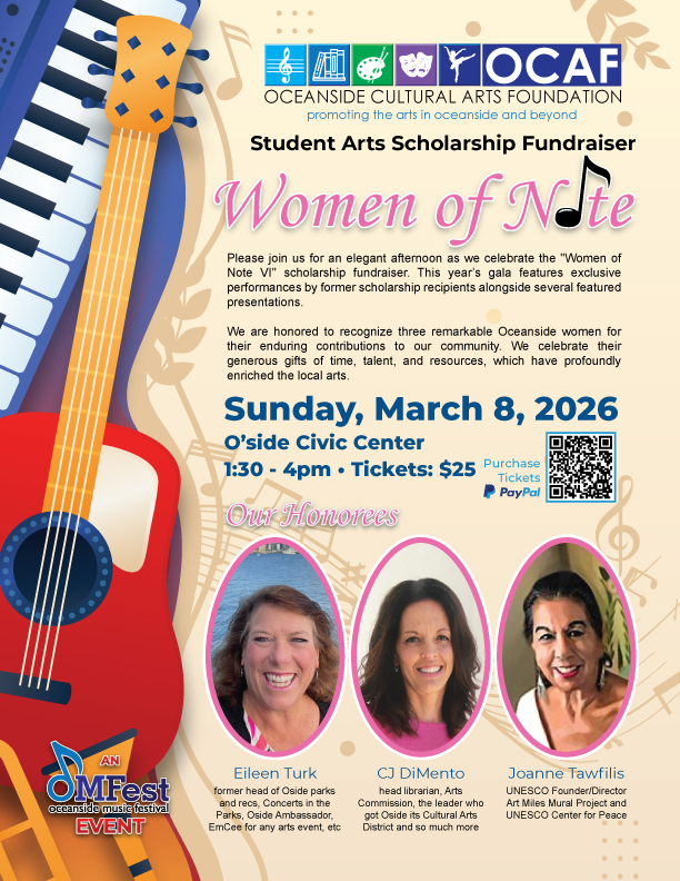 O'Side Bakery 3815 Mission Ave, Unit 101, Oceanside, United StatesArt Walls O’Side Presents: Lori Sandstrom — “Coastal Inspirations” Date & Time: Wednesday, November 12, 2025 | 5:30 PM – 7:30 PMLocation: O’side Bakery, 3815 Mission Ave, Suite 101, Oceanside, CA Exhibit Dates: November 12, 2025 – January 5, 2026 Description: Join us for the opening reception of Art Walls O’Side featuring the vibrant, coastal-inspired artwork of Lori Sandstrom. Known for her expressive use of color and texture, Lori’s work…